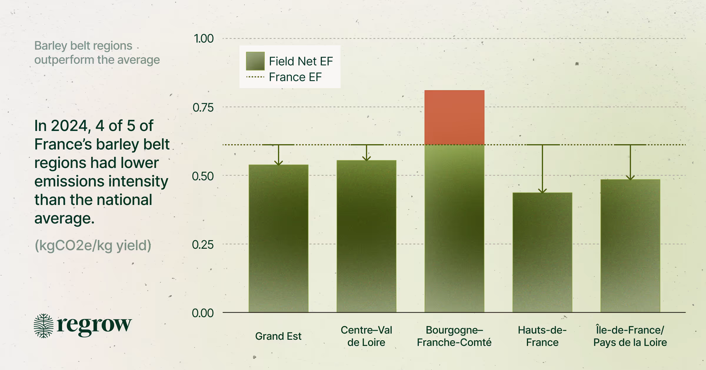 To understand the local nuance, we examined emissions factors at a more granular, regional level. The five regions on the map above represent France’s “barley belt,” where 60% of the country’s barley is grown: