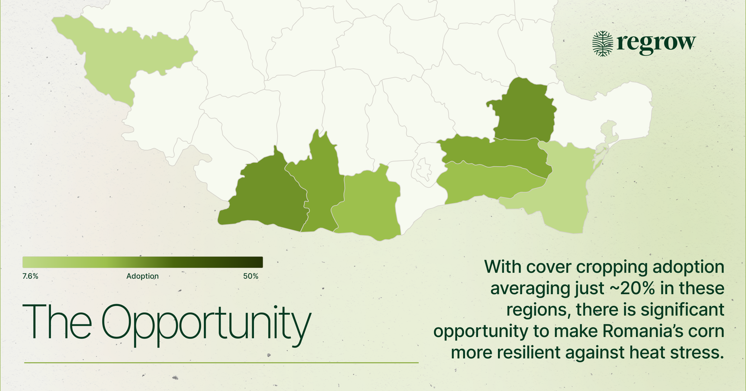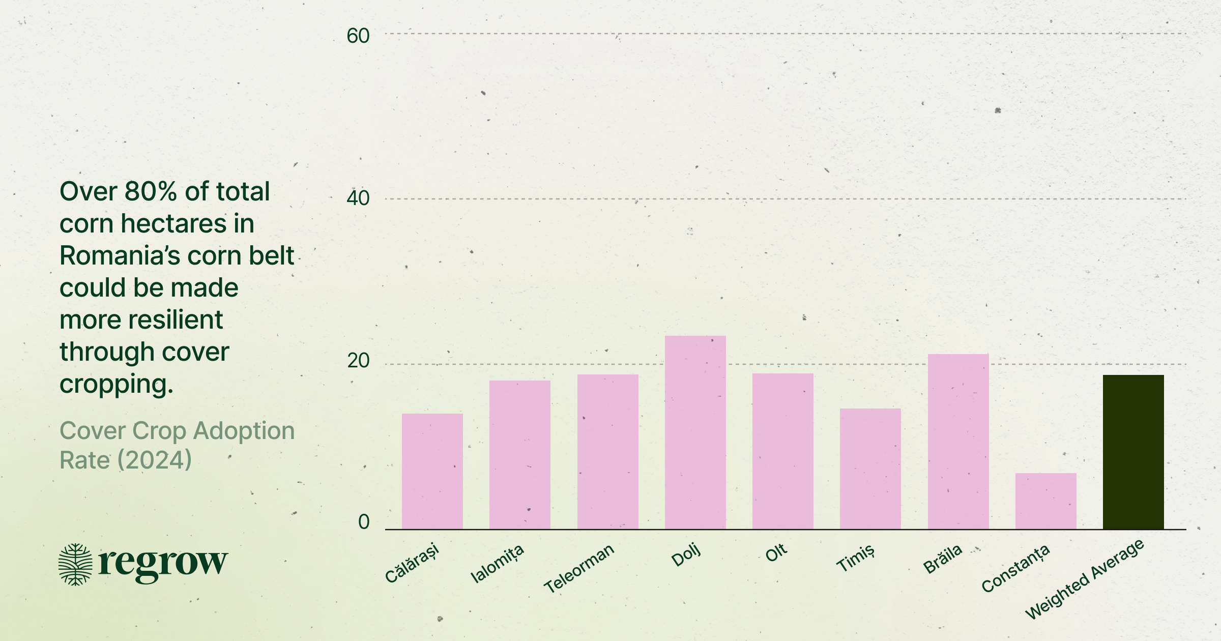 In these same corn-producing regions in Romania, cover cropping adoption rates show a lot of opportunity for improvement:
