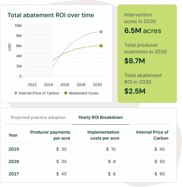 PlanAI delivers a detailed cost-benefit analysis, including grower incentives, project development expenses, and total GHG savings. These data are built into a year-by-year forecast tracking progress to your 2030 targets, with interventions prioritized to achieve the highest ROI. Underpinning this roll up is a detailed breakdown of the regions, crops, and regenerative practices included in your plan.