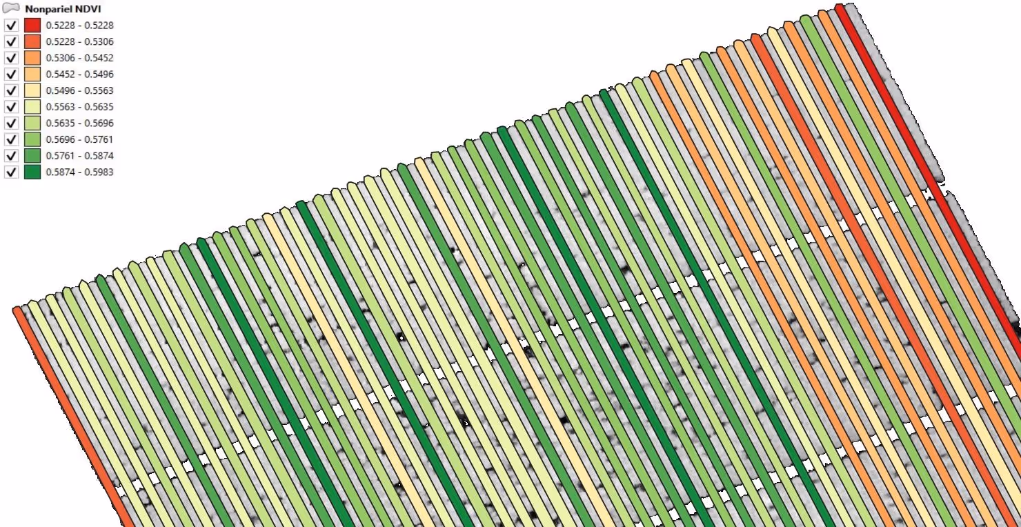 Zonal statistics were calculated for each one of the rows. Average NDVI and CCCI have been generated and the values were used to colour the rows’ boundaries.